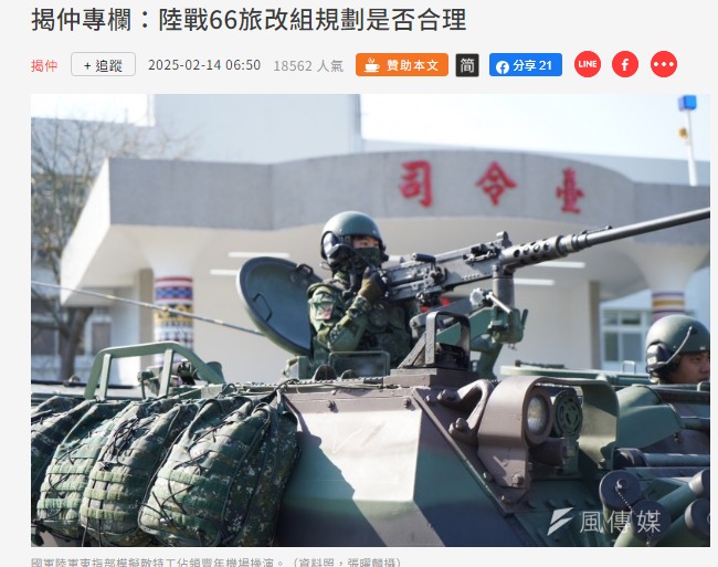 美軍陸戰隊之所以裁撤戰車部隊,轉型為濱海作戰團,主要是服膺日後美軍在西太平洋與共軍交戰時的戰術調整,也就是以陸戰隊執行「遠征前進基地作戰」。改組後的美國海軍陸戰隊濱海作戰團的任務,與身為戰略預備隊的陸戰66旅完全不同,若以濱海作戰團作為陸戰66旅改組的理論依據,並不恰當。(圖片擷取自風傳媒網頁)