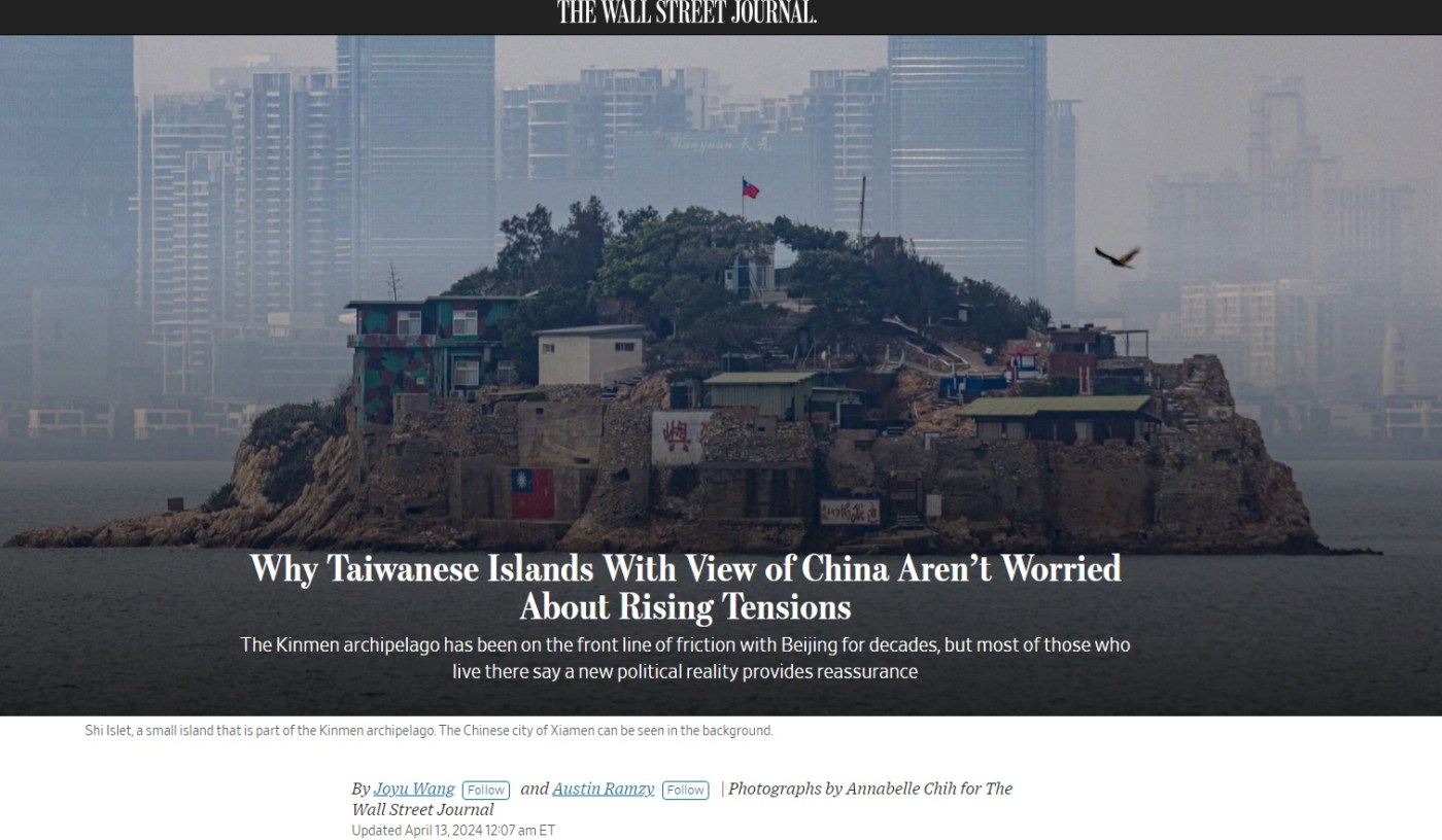 “China’s firepower, whether through its air force or naval weapons, can easily surpass Kinmen and directly hit Taiwan’s main island,” Chieh said. (圖片擷取自華爾街日報網頁)