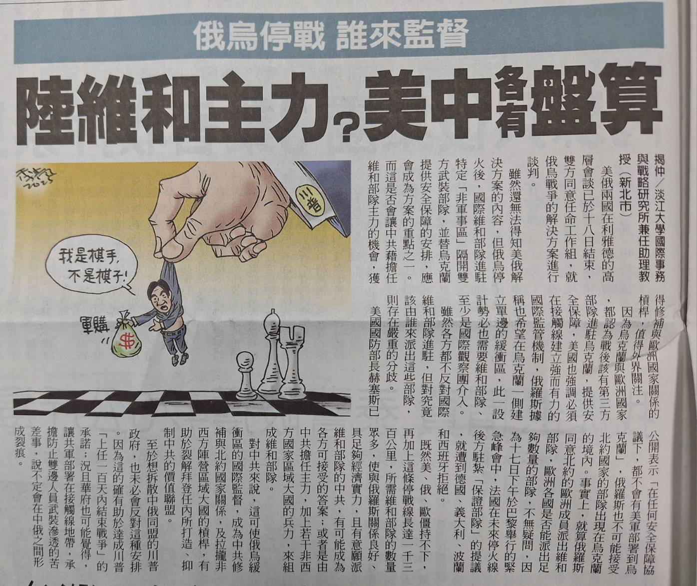 雖然還無法得知美俄解決方案的內容,但俄烏停火後,國際維和部隊進駐特定「非軍事區」隔開雙方武裝部隊,並替烏克蘭提供安全保障的安排,應會成為方案的重點之一。而這是否會讓中共藉擔任維和部隊主力的機會,獲得修補與歐洲國家關係的槓桿,值得外界關注。