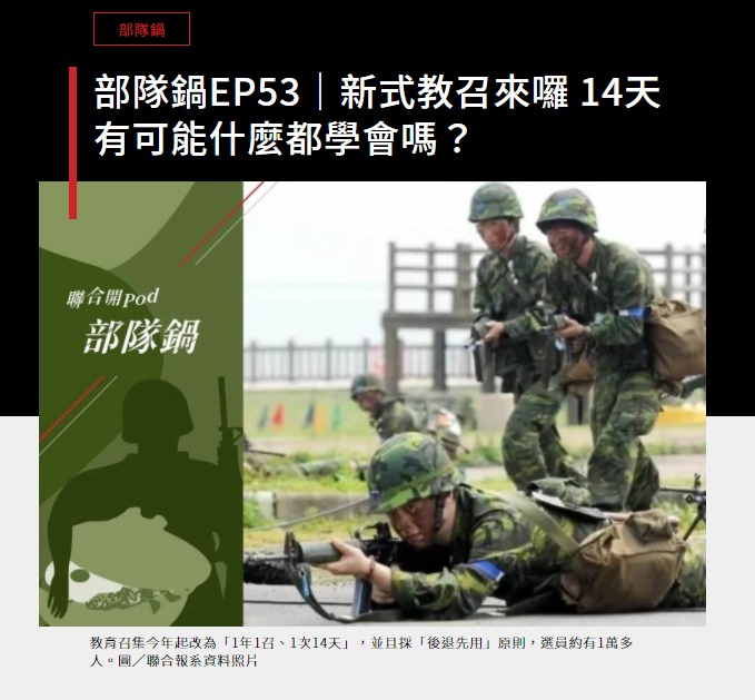 14天內什麼都要會,反而可能什麼都不精實,有經驗的軍士官數量又不足,如何應付未來聯合三棲立體攻擊的共軍?國防部能不能讓後備部隊做好自己最熟悉的軍事技能?打過迫砲的,教召就複習迫砲,射過火箭彈的,就再扛火箭彈。基本戰鬥教練,就好好把新訓課程溫故知新。落實編組,專心做好一件事,保家衛國其實不難。